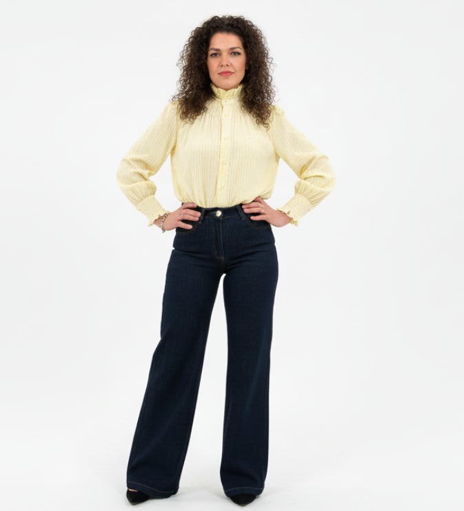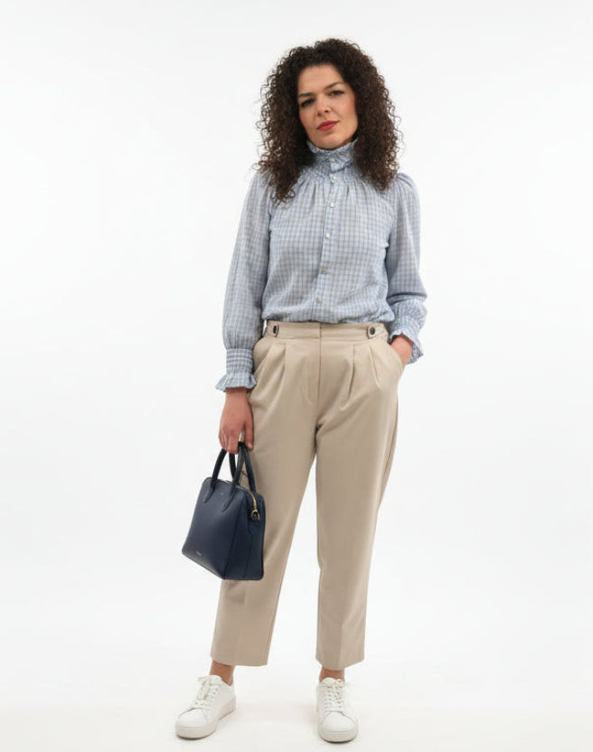 Camisa de manga larga, con abotonadura, cuello y puños detalles en nido de abeja con volante. Elegante estampado de cuadro tipo Vichy.
