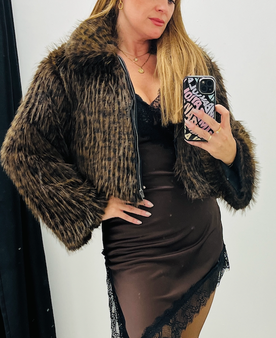 Chaqueta de pelo sintético, en marrón chocolate. Talla única que abarca entre la talla 36 y la 42.