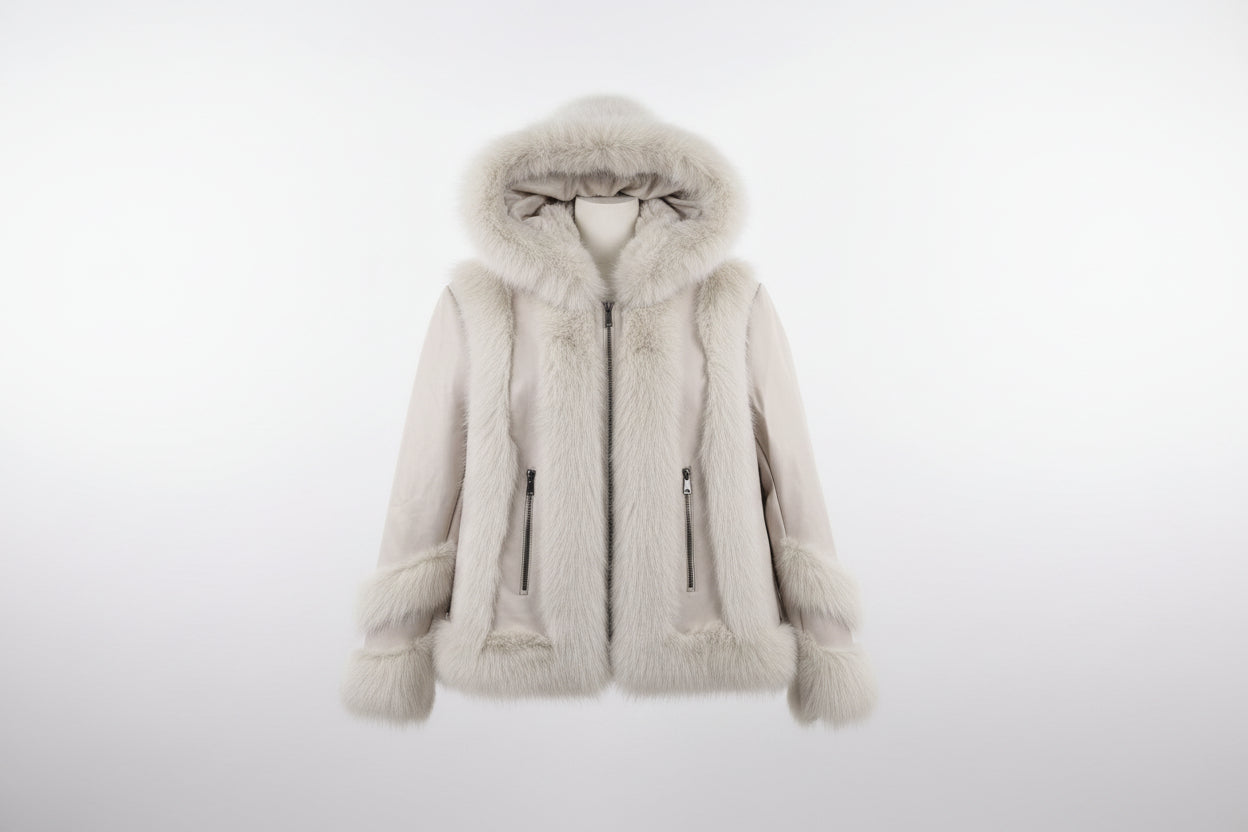 Chaqueta de señora combinada en pelo y polipiel. Disponible desde la talla M a la 3XL. También disponible en negro.