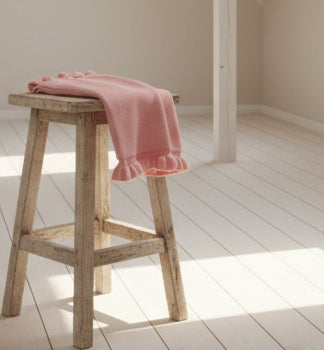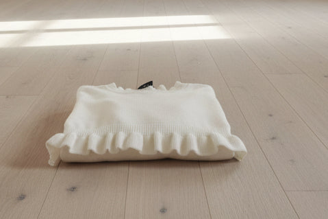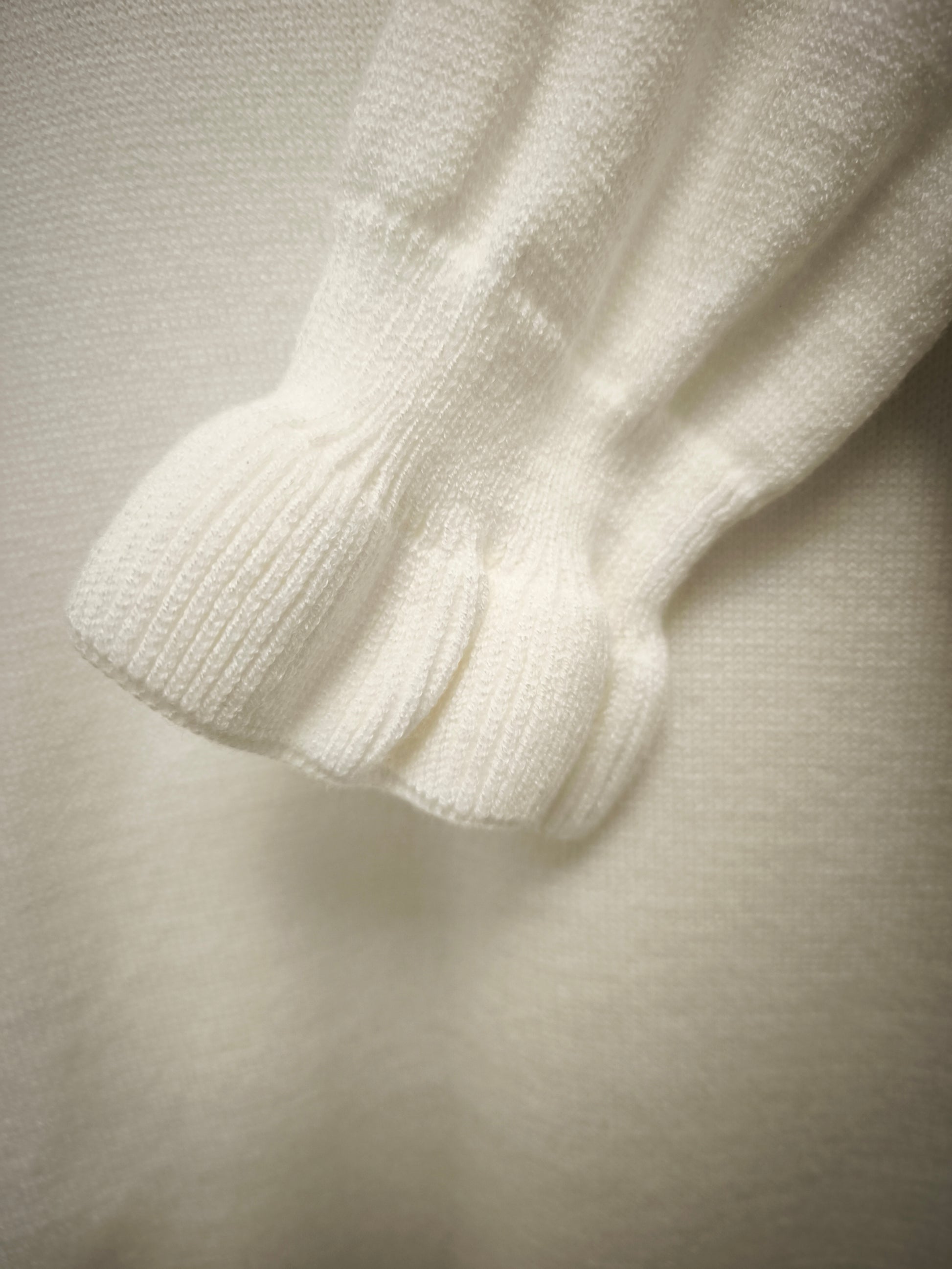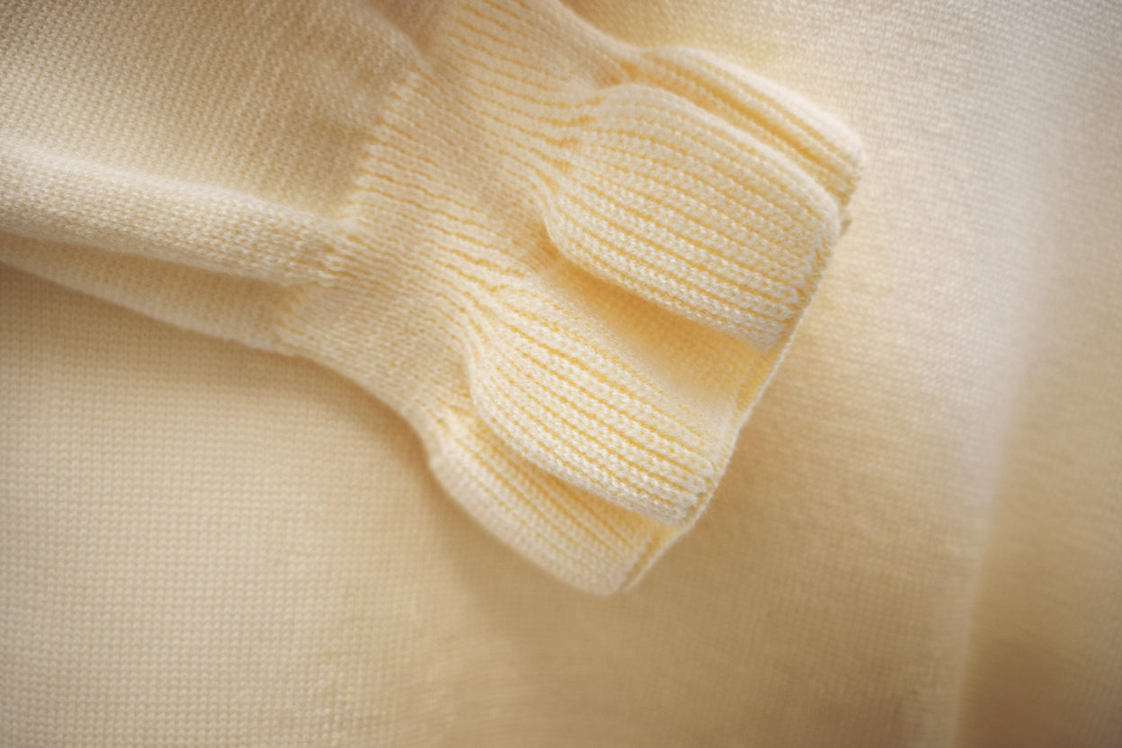 Jersey de punto, cuello redondo, mangas terminadas en el mismo punto del jersey con pequeñas tablas a modo de volante. Bajo misma terminación que las mangas.