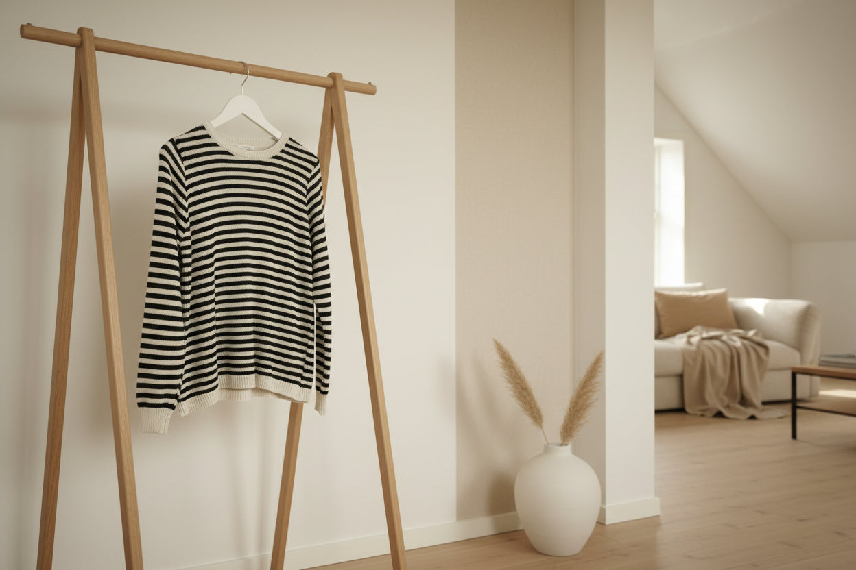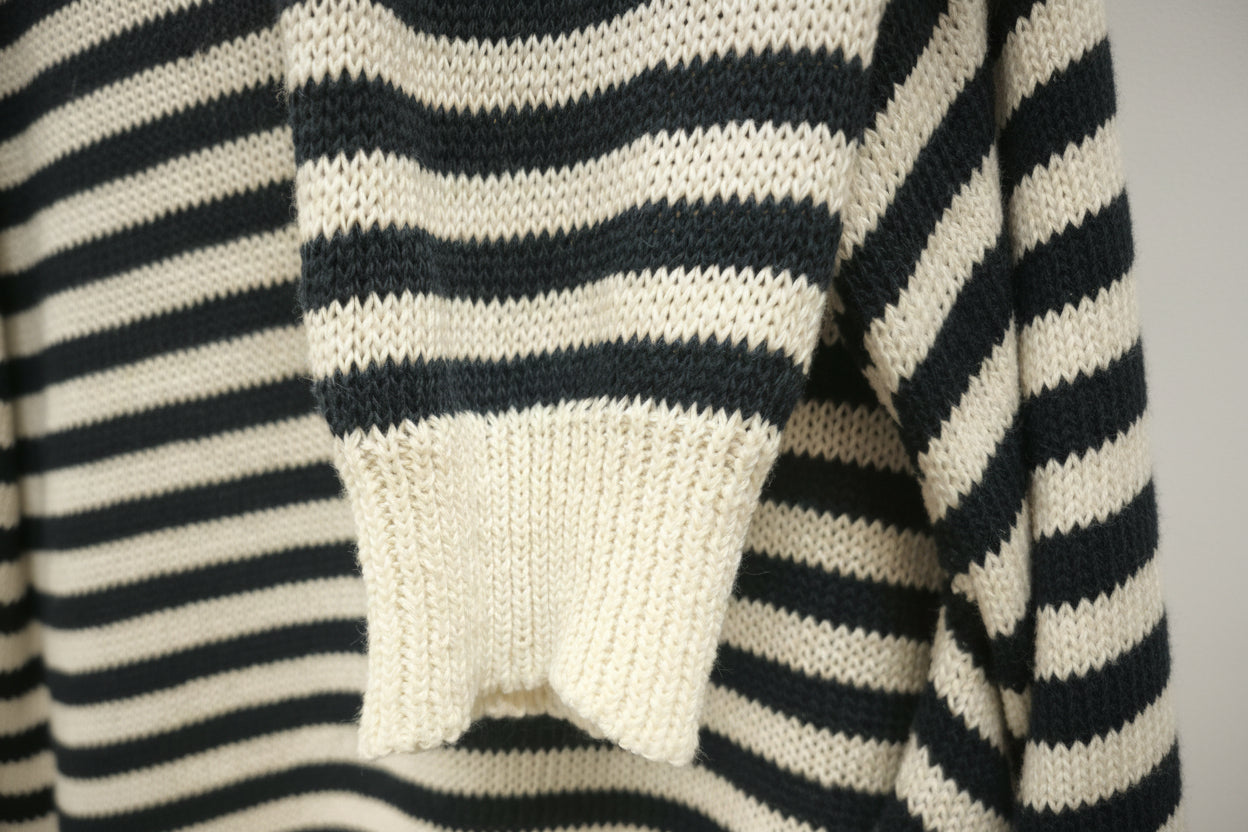 Jersey de punto a rayas azul marino y blanco, puños, bajo y cuello en contraste blanco. Tejido de alta calidad.