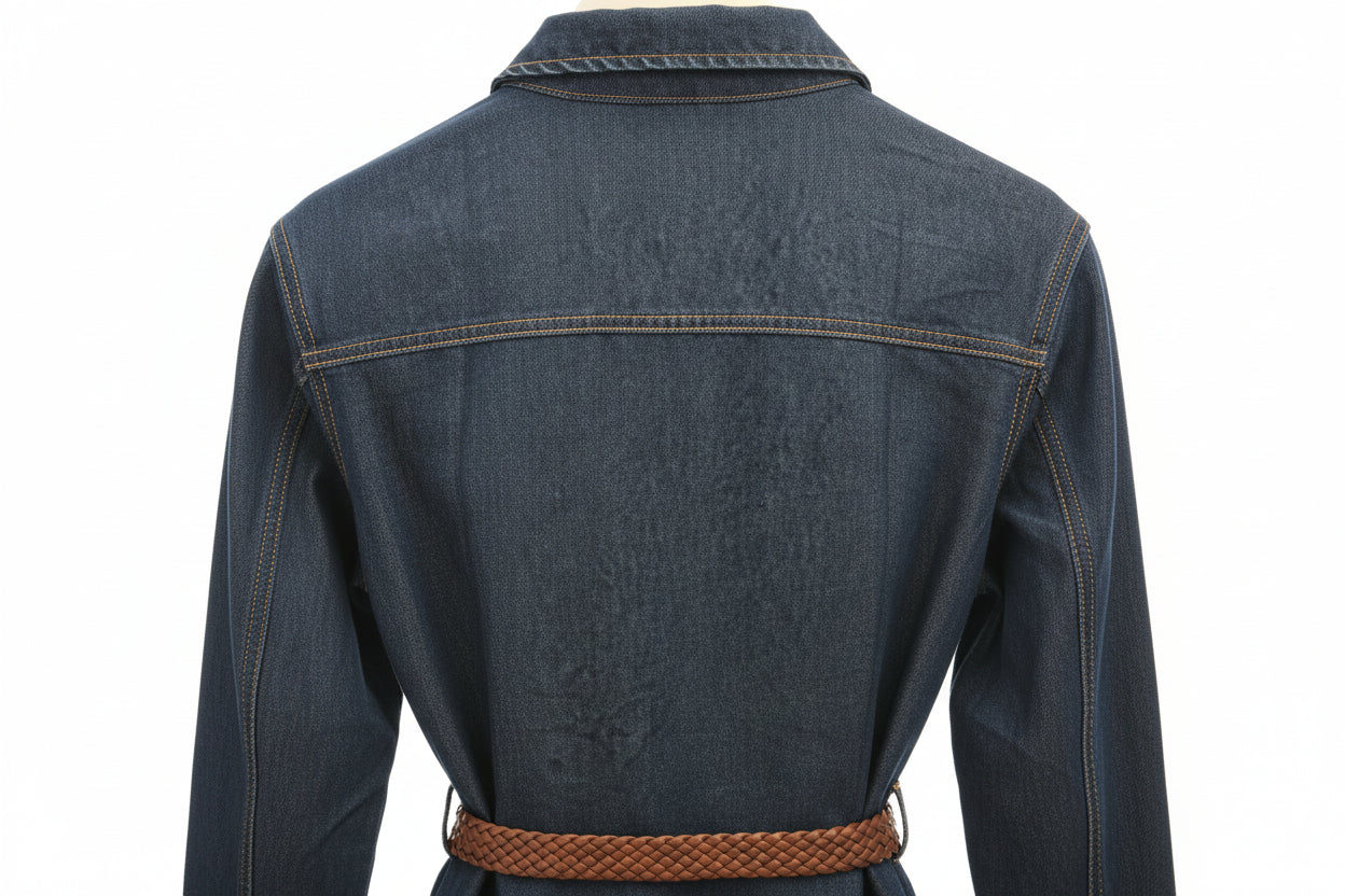 Vestido camisero Azul Índigo en Denim, bolsillos delanteros a la altura del pecho, y canesú en la espalda. Incluye cinturón trenzado en color Marrón chocolate. Manga larga con botón en puño. Largo midi, tejido suave y cómodo.